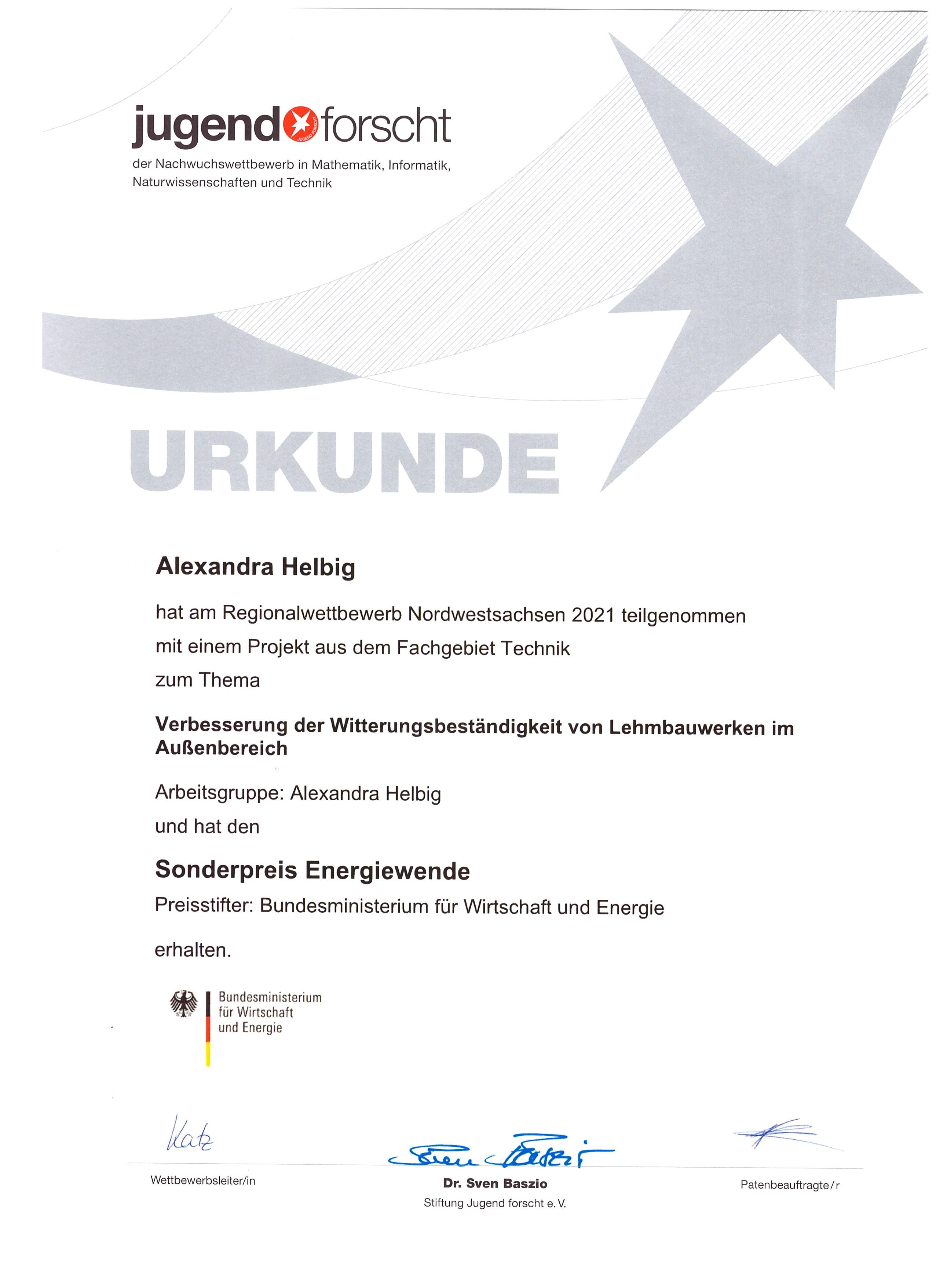 wir freuen uns, mitteilen zu können, dass Alexandra Helbig, Schülerin der 9. Klasse am Gymnasium Brandis in Sachsen, erneut im Nachwuchswettbewerb “Jugend forscht” für ihre Untersuchungen “Verbesserung der Witterungsbeständigkeit von Lehmbauwerken im Außenbereich” ausgezeichnet wurde.